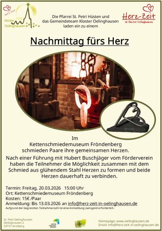 Termin: Freitag, 20.03.2026 15:00 Uhr Ort: Kettenschmiedemuseum Fröndenberg Kosten: 15€ /Paar Anmeldung: Bis 13.03.2026 an info@herz-zeit-in-oelinghausen.de